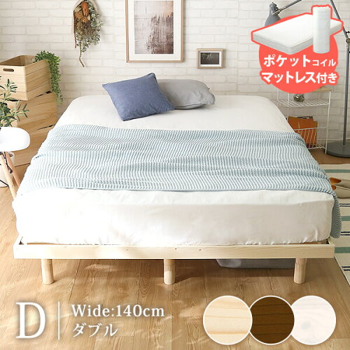 【商品について】 パイン材高さ3段階調整脚付きすのこベッド(ダブル)■サイズ:【商品サイズ】(約)幅 140 × 奥行 200 × 高さ 26 cm【商品重量】25.2kg■カラー:ホワイト、ブラウン、ナチュラル(無塗装)■素材:材質:フレーム:天然木(パイン材)、すのこ:積層合板(LVL)■その他:【梱包サイズ】:(2-1)(約)幅 142 x 奥行 25 x 高さ13 cm(2-2)(約)幅 100 x 奥行 21 x 高さ13 cm【梱包重量】(2-1)17.25kg(2-2)9.15kg【商品について】ポケットコイルスプリングマットレス【-Robilia-ロビリア】(ダブル用)※ロール梱包でラクラク搬入可能!※■サイズ:外寸:(約)幅140cmx長さ195cmx高さ20cm※商品重量:(約)25kg■カラー:アイボリー中材:ポケットコイル、ウレタンフォーム、フェルト、不織布■素材:側地:ポリエステル100% ■その他:・完成品でのお届けです・梱包サイズ:(約)幅39x奥行39x高さ78cm・梱包重量:(約)27kg仕様詳細商品名パイン材高さ3段階調整脚付きすのこベッド(ダブル)サイズシングル:(約)幅98x奥行200x高さ26cmセミダブル:(約)幅120x奥行200x高さ26cmダブル:(約)幅140x奥行200x高さ26cmカラーホワイトウォッシュ、ブラウン、ナチュラル特徴北欧産パインフレームを使用通気性と耐久性に優れた頑丈設計低ホルムアルデヒド仕様材質フレーム:天然木(パイン材)すのこ:積層合板(LVL)静止耐荷重200kg梱包サイズシングル:(約)幅100x奥行26x高さ20.5cmセミダブル:(約)幅122x奥行26x高さ20cmダブル:【2-1】(約)幅142x奥行25x高さ13cm、【2-2】(約)幅100x奥行21x高さ13cm組立当商品は、お客様組み立ての商品です。