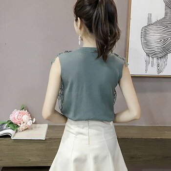 サマ-ニット ノースリーブニット レースフリル付夏ニット レースブラウス ノースリーブ タンクトップ 大人可愛い 着痩 トップス レディース 爽やか