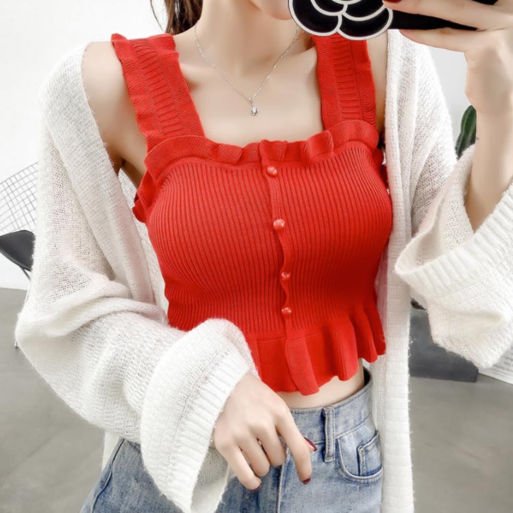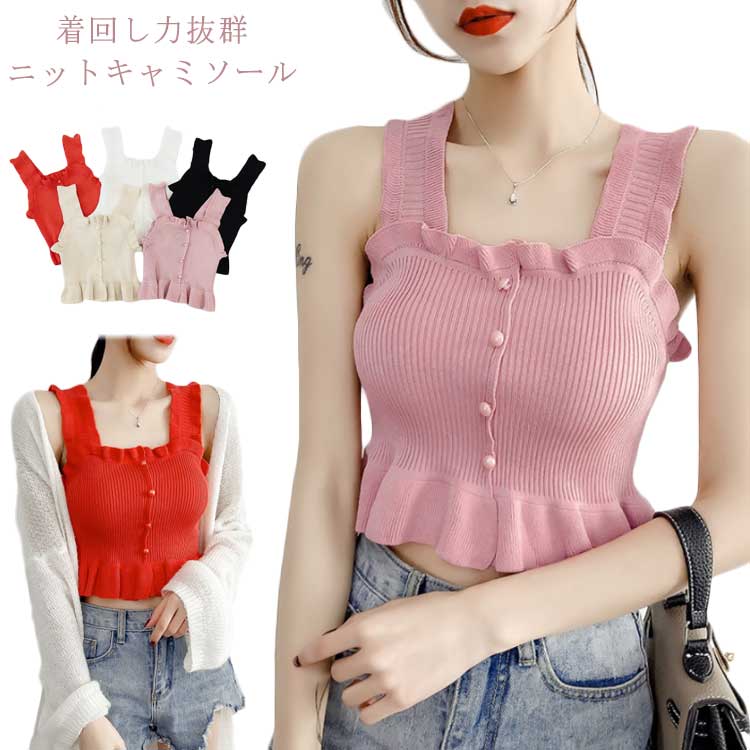 サマーニット レディース ニットキャミソール リブニット キャミソール 無地ニット ニットトップス フリル ビジュー付き 伸縮性 セクシー シンプル お洒落 キレイめ 夏新作